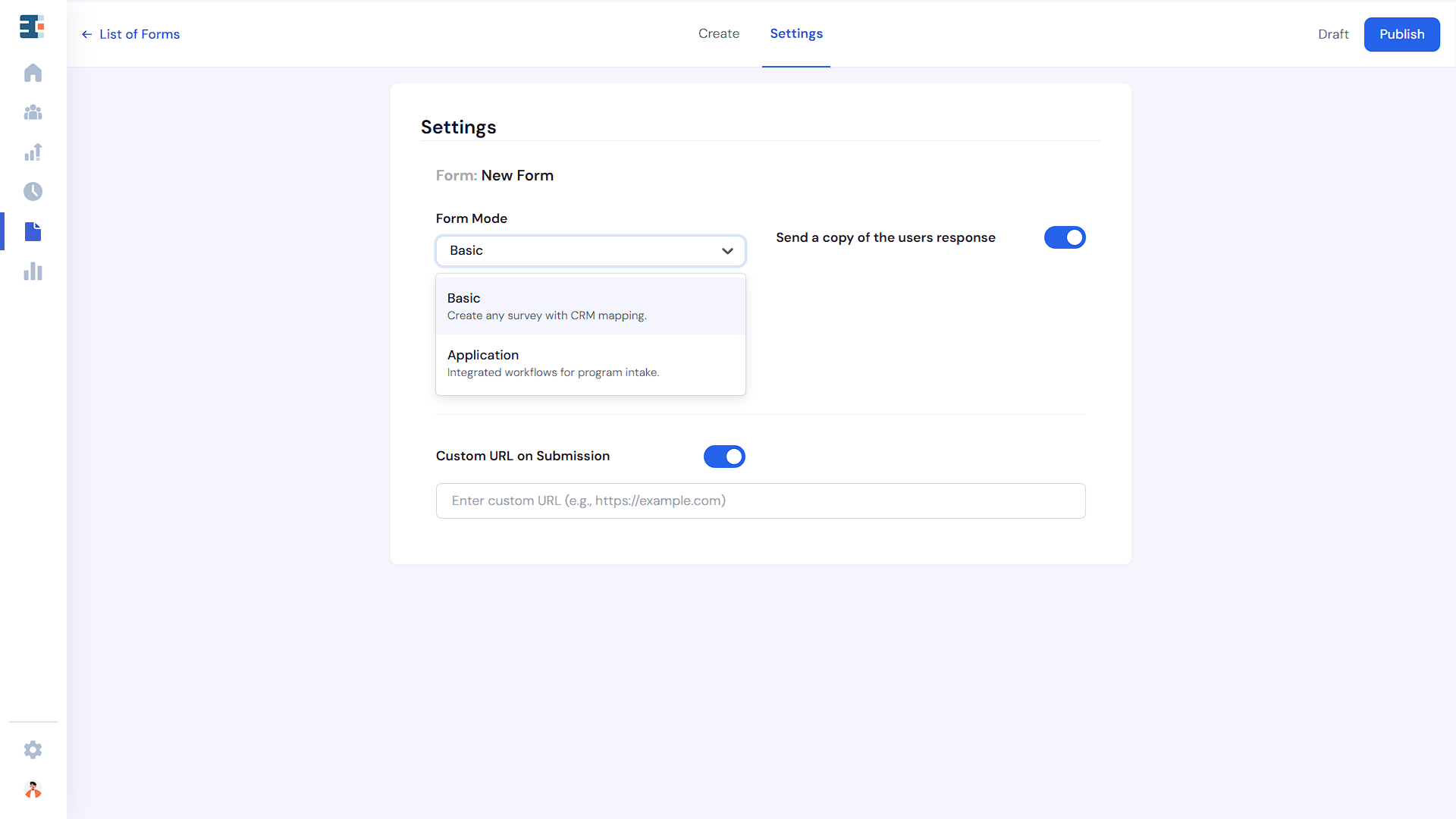 Forms are automatically saved as drafts until published. Drafts appear alongside published forms on the Forms List Page.