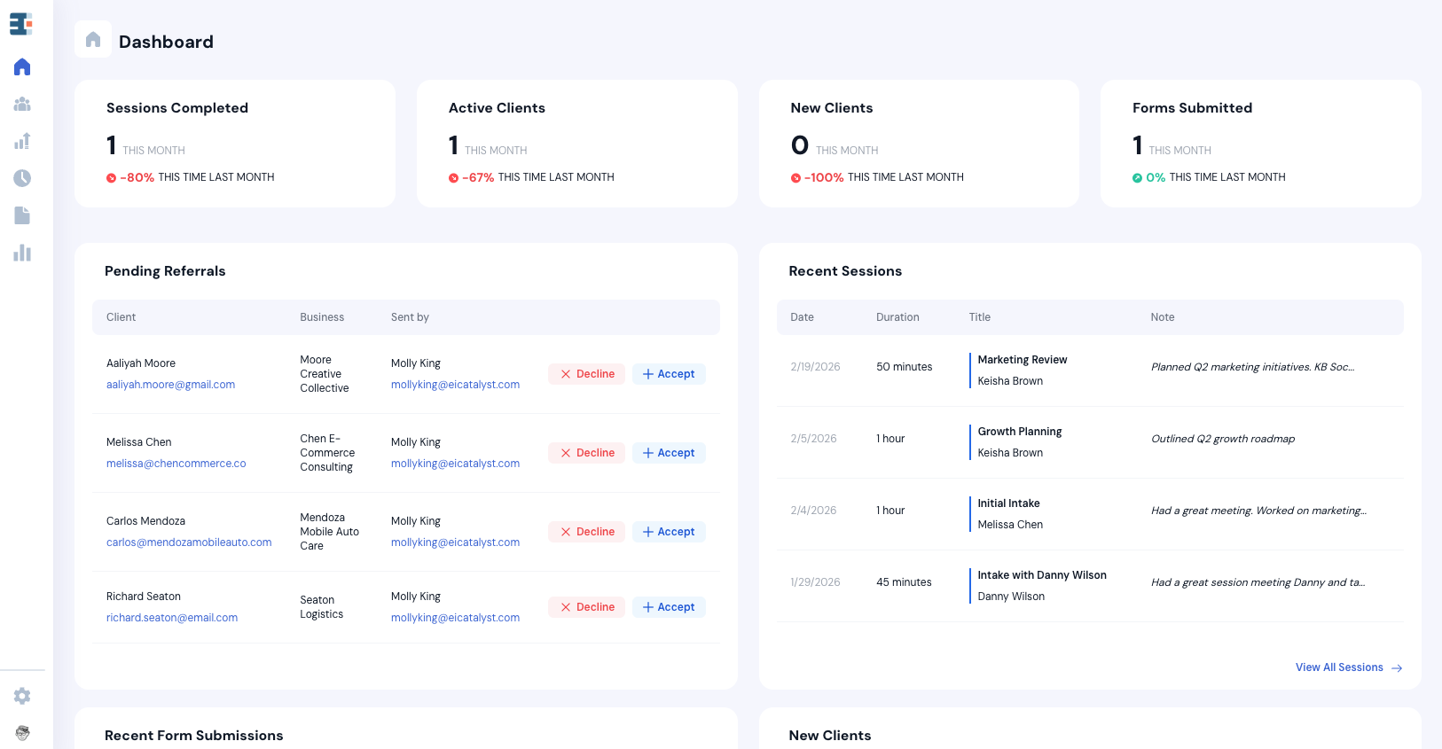 Sessions and referrals are two primary ways that 1:1 services are delivered, tracked, and attributed in Catalyzer.