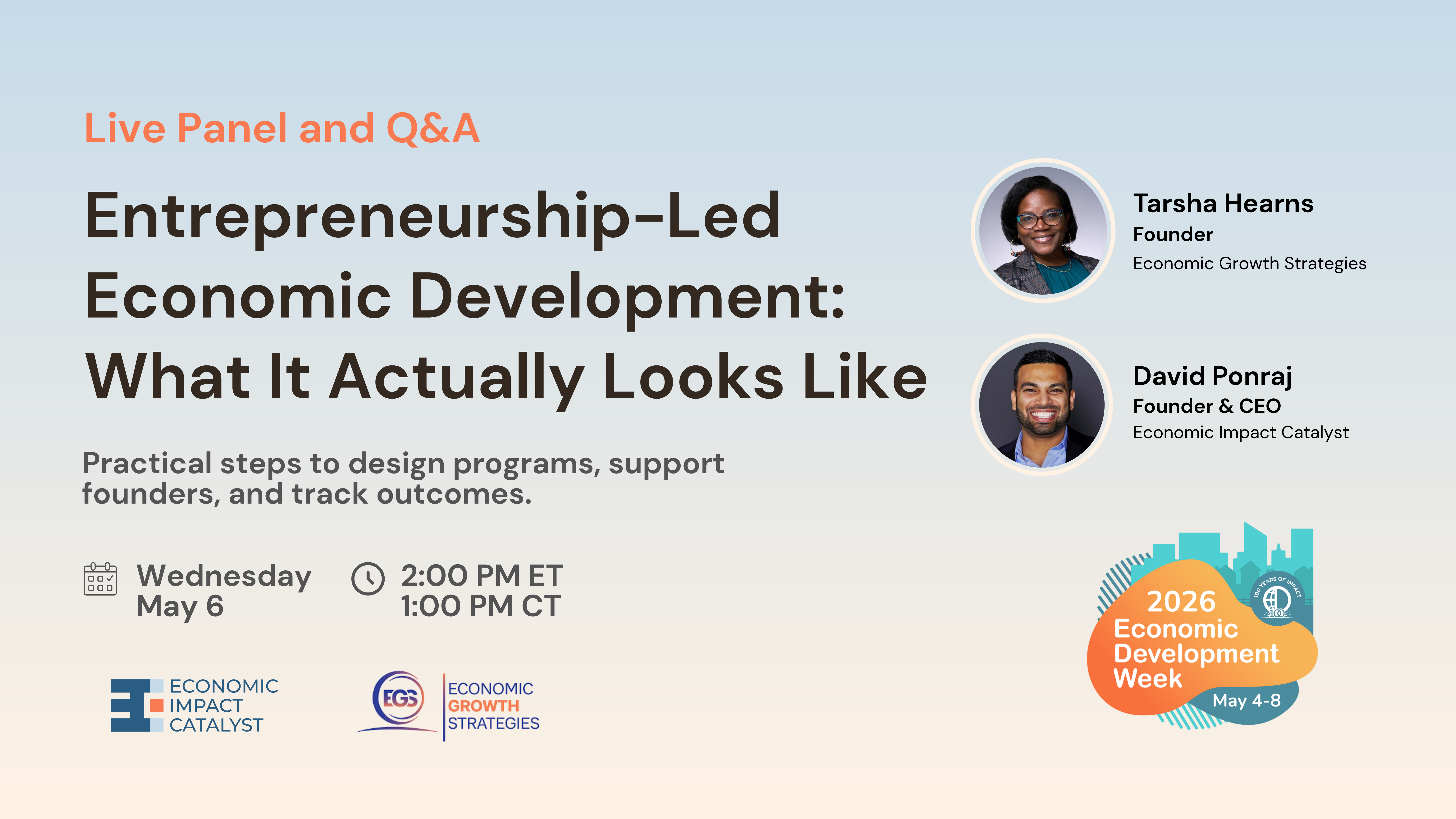 You’ll hear from Tarsha Hearns of Economic Growth Strategies, who brings deep expertise in ecosystem strategy, program design, and technical assistance, alongside David from Economic Impact Catalyst, who works with organizations to implement the systems needed to manage programs and report outcomes. Together, they’ll share how communities can move from disconnected efforts to a coordinated approach that supports founders and demonstrates measurable impact.